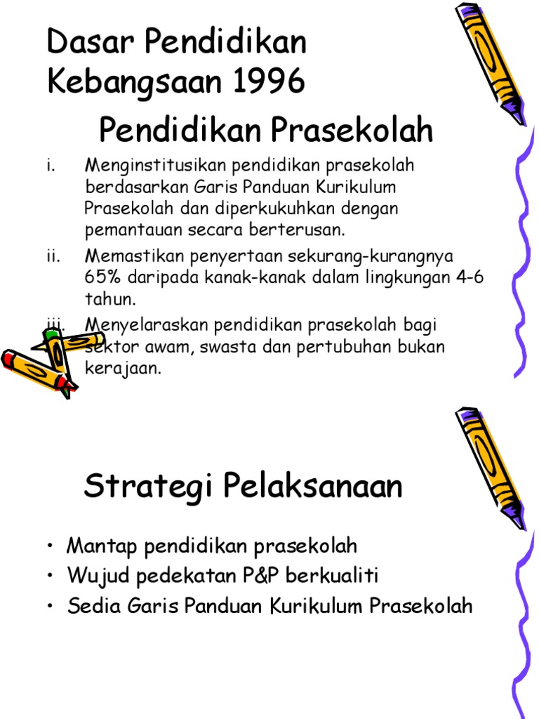 Strategi Pelaksanaan Beberapa strategi telah digubal untuk mencapai matlamat Dasar Pendidikan yang telah ditetapkan seperti berikut. Apa yang dianggap sebagai.
